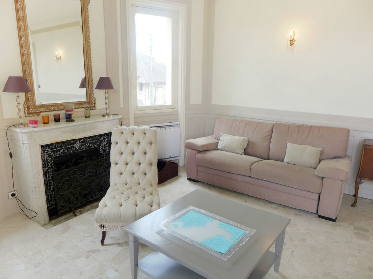 Residentie "Marie Antoinette", van 2 verdiepingen. In het centrum van Cabourg, in de plaats, 200 m van zee, 200 m van het strand. Openbare parkeerplaatsen in de straat. Winkel 200 m, supermarkt 1.7 km, restaurant 200 m, bushalte "Hôtel de Ville" 900 m, thermaalbad "Thalazur" 900 m. Golfterrein (9 holes) 1.8 km. Geen lift.