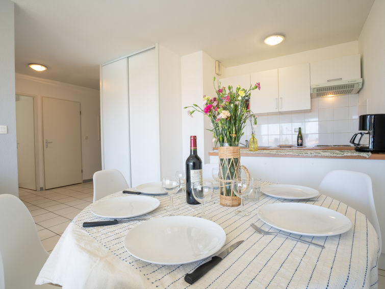 Appartement 3-kamers 60 m2. Licht, mooi ingericht: woon-/eetkamer met 2 divanbedden (90 cm, lengte 190 cm), TV (Flatscreen TV). Uitgang naar het terras. 1 kamer met 1 2-pers bed (160 cm, lengte 200 cm). 1 kamer met 2 bedden (90 cm, lengte 200 cm). Kookhoek (afwasmachine, 4 keramische glas kookplaten, broodrooster, waterkoker, magnetron, elektrische koffiemachine). Badkamer, aparte WC. Elektrische verwarming. Terras 14 m2. Terrasmeubelen. Uitzicht op het zwembad. Ter beschikking: strijkijzer, haardroger. Internet (WiFi, gratis). Parkeerplaats nr. 304 (overdekt). Maximaal 1 huisdier/hond toegestaan. Rookmelders. 64189000793B7