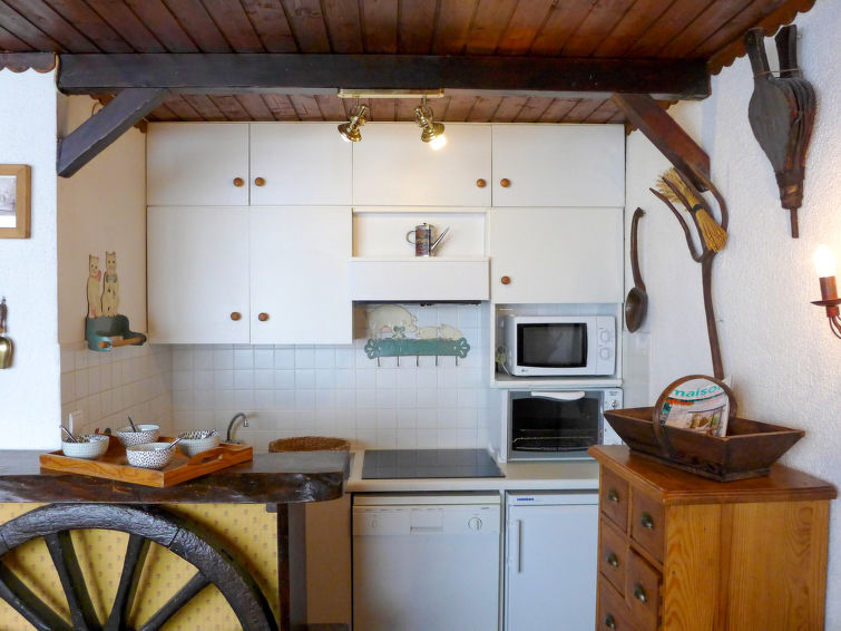Studio 1-kamer 32 m2 op de 1e verdieping. Woon-/eetkamer met 1 bed (90 cm, lengte 190 cm), 1 2-pers divanbed (140 cm, lengte 190 cm), TV en DVD. Uitgang naar het balkon. Kookhoek (afwasmachine, 3 keramische glas kookplaten, waterkoker, magnetron, elektrische koffiemachine). Bad/WC. Elektrische verwarming. Klein balkon, op het zuiden gelegen en op het zuidoosten gelegen. Mooi uitzicht op de bergen. Ter beschikking: Internet (WiFi, extra). TV alleen FR. Rookmelders. 74056002562M5